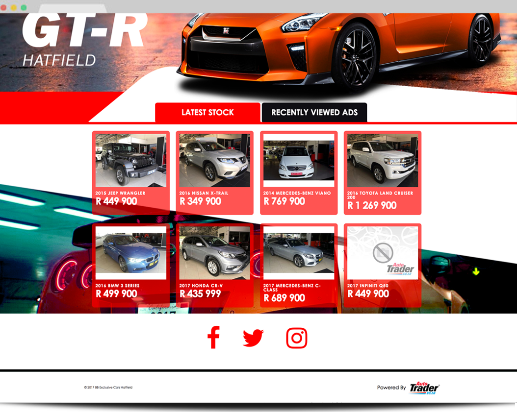 GTR-Exclusive is one of many vehicle dealerships that advertise and digitally engage with their prospective clients through using the AutoTrader's product packages. As part of the package, the dealer is given a fully mobile responsive wordpress website. I initially designed two responsive concepts, using a standardized template which Autotrader specifically built for their niche market of dealers and buyers nationwide, This also included a basic style guide as well.
